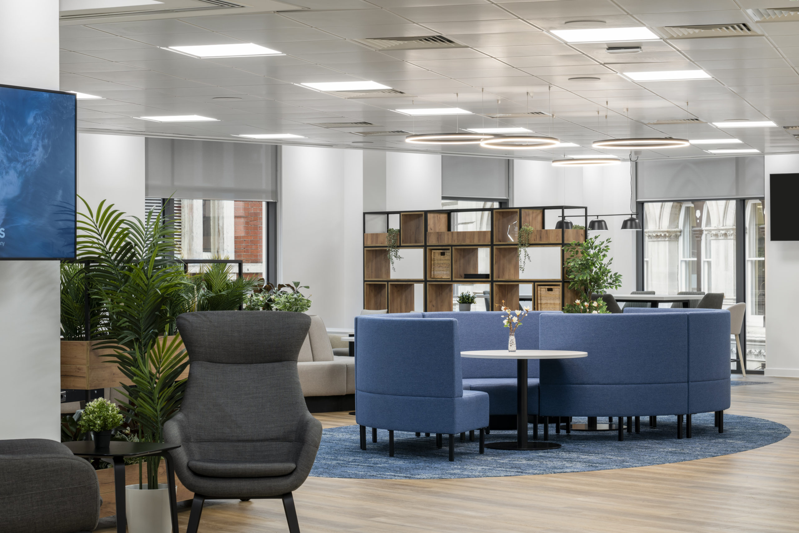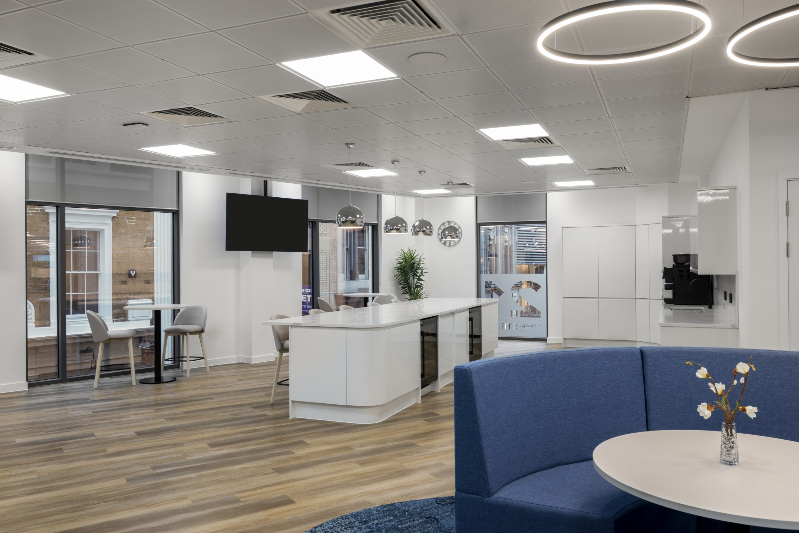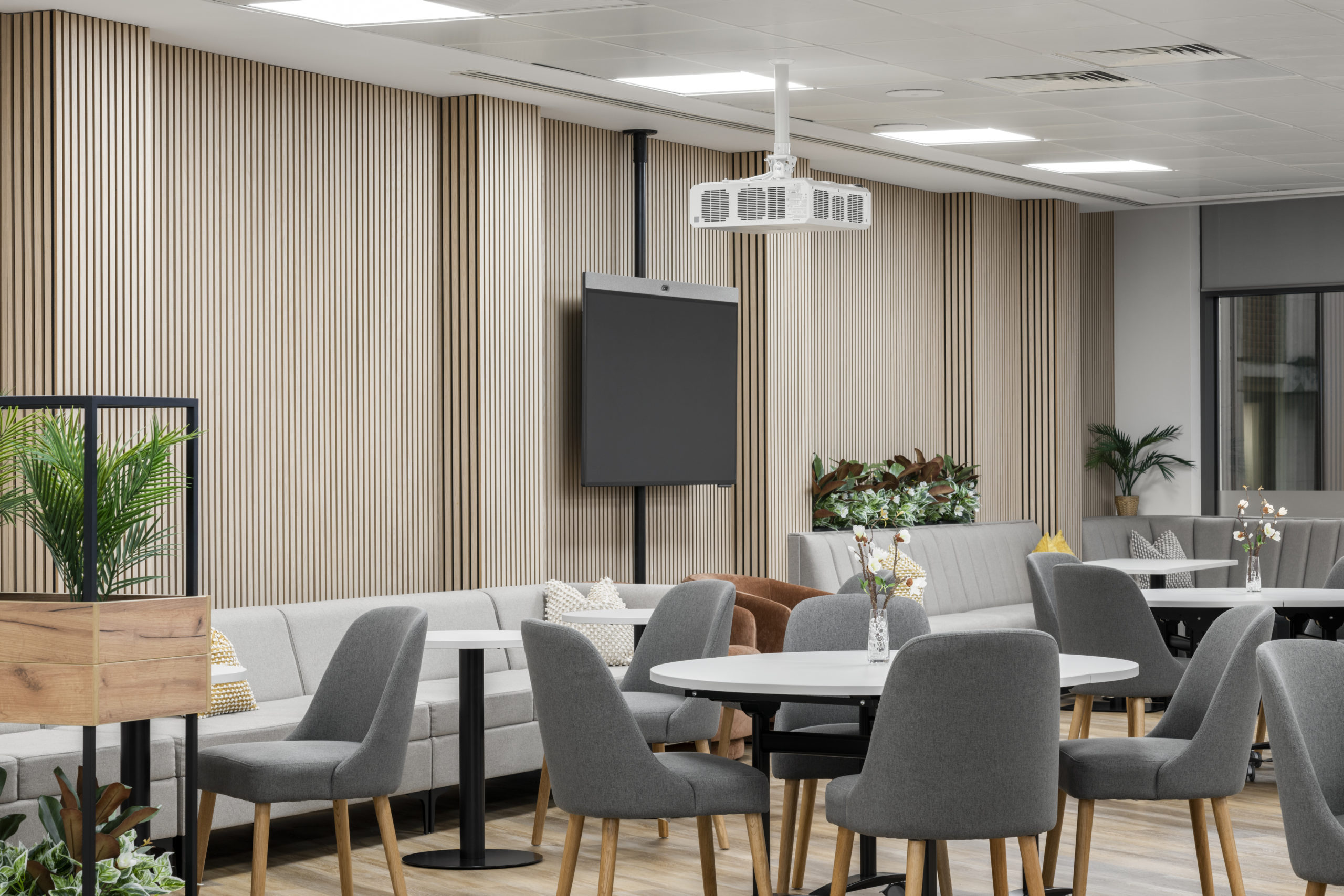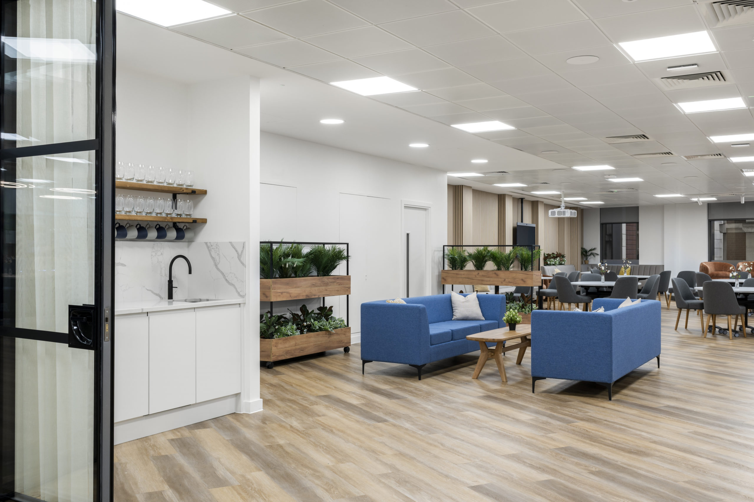A bespoke stage formed a central architectural feature, fully integrated with lighting and technology. High-quality LVT flooring was installed throughout, complemented by a comprehensive FF&E package and bespoke joinery, including storage walls, kitchen areas and bench seating. Together, these elements create a refined, durable environment built for long-term performance.