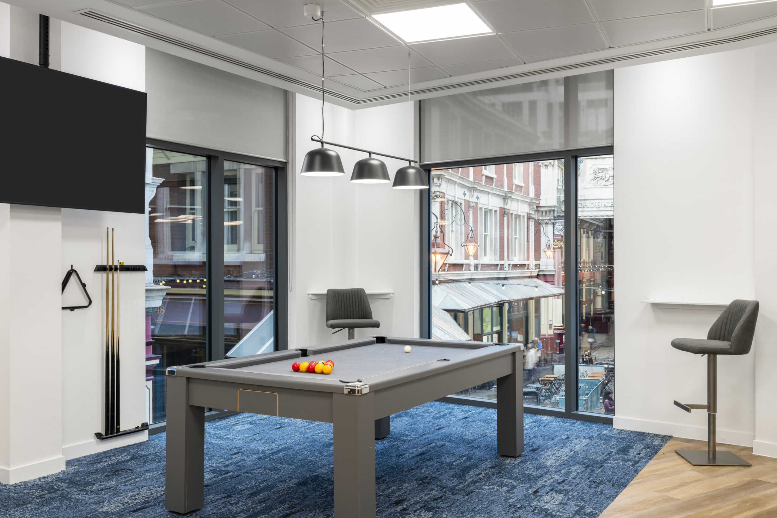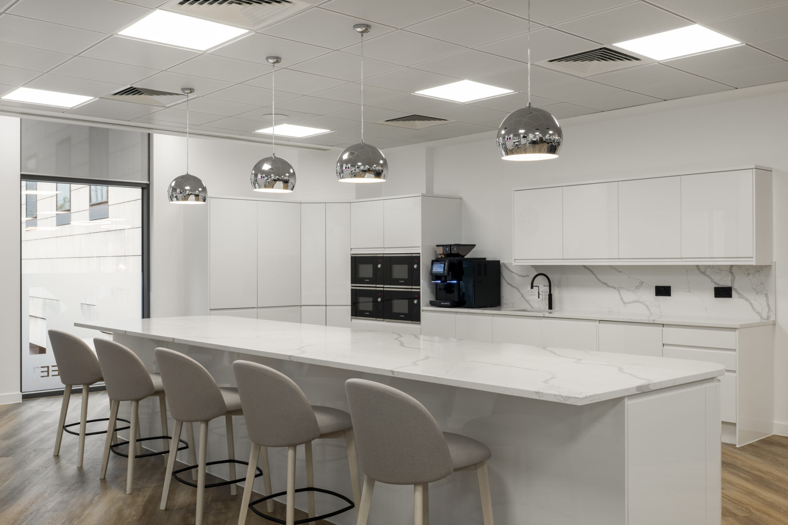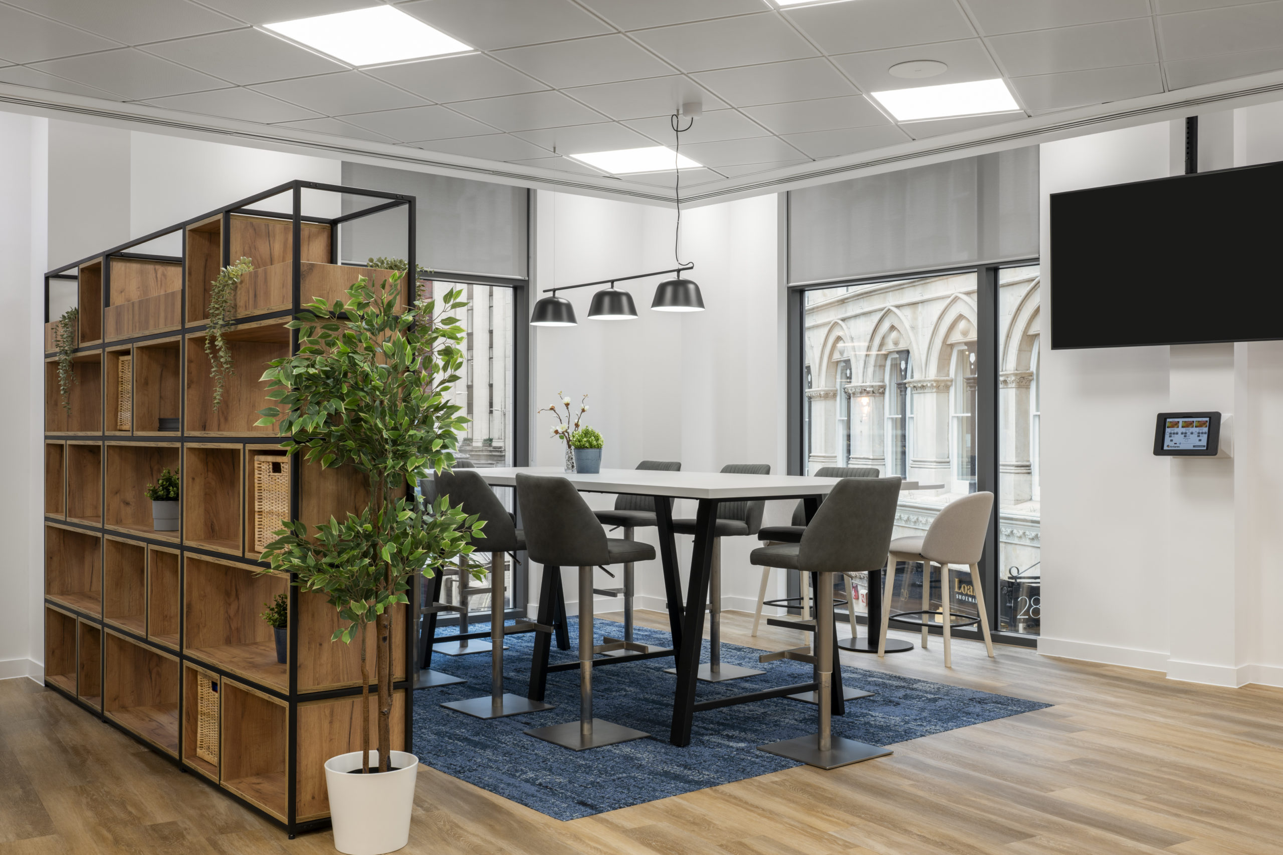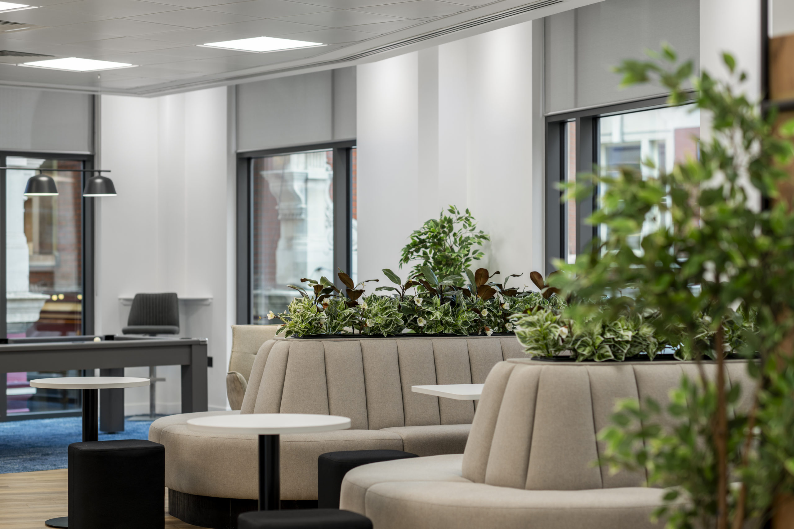 A bespoke stage formed a central architectural feature, fully integrated with lighting and technology. High-quality LVT flooring was installed throughout, complemented by a comprehensive FF&E package and bespoke joinery, including storage walls, kitchen areas and bench seating. Together, these elements create a refined, durable environment built for long-term performance.