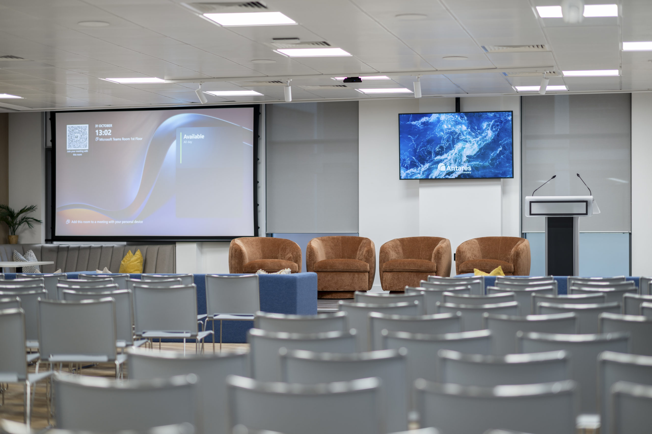 The layout was carefully planned to support a variety of working styles, combining modern finishes with practical functionality and fully integrated technology. Key features included a central presentation space with a raised stage, enhanced acoustics, upgraded services and a coordinated furniture scheme that reinforces the overall design vision.