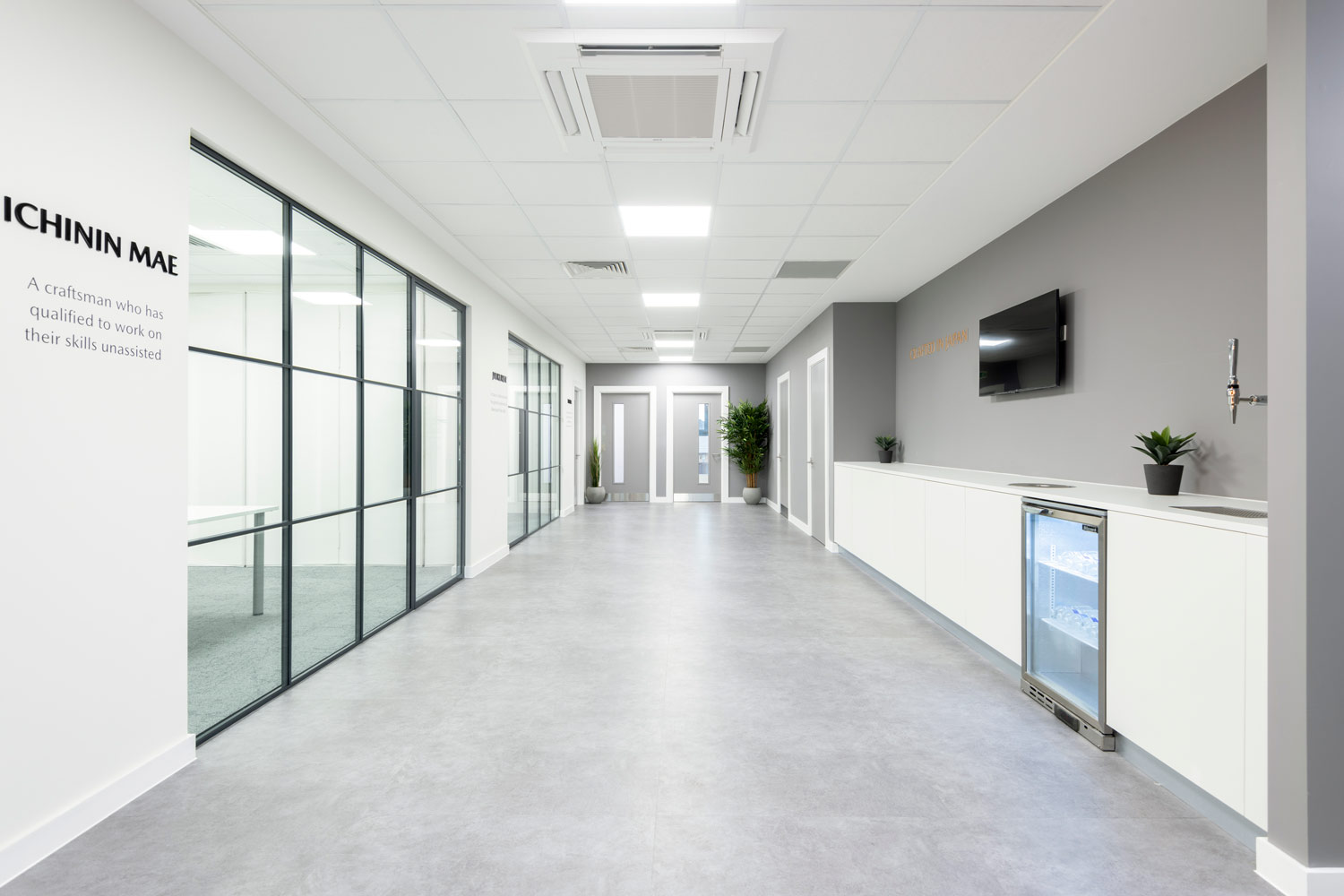 The new Mazda Academy combines a practical and engaging design and features a large technical workshop, a digital suite, agile working areas with fully adaptable classrooms, acoustically treated live broadcasting rooms, a private office, and meeting rooms. There is also a striking front of house reception space, a Japanese-themed canteen, and refreshment areas for social breaks.